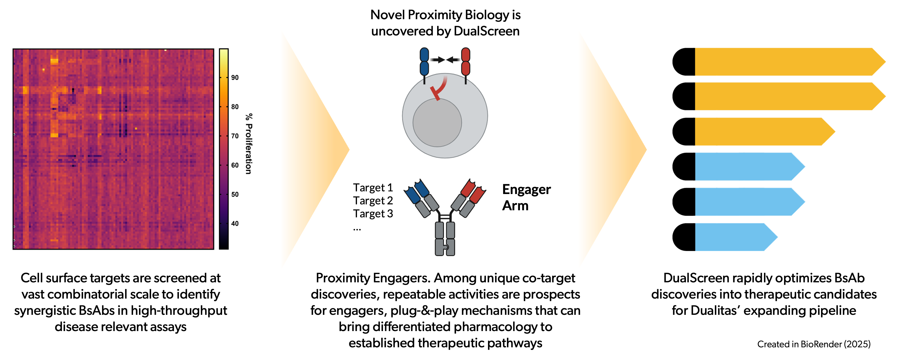 Existing BsAb discovery approaches narrowly focus on pre-determined target pairs of known biology. In contrast, DualScreen functionally screens cell surfaceomes – the entire cell surface – across a vast range of targets and epitopes to identify BsAb combinations that are truly synergistic rather than simply additive. Up to 100,000+ unique bispecific combinations can be arrayed and screened in high throughput functional assays to identify BsAbs and co-targets with synergistic activities unachievable by conventional therapeutics. DualScreen discovers powerful cell surface proximity mechanisms and rapidly delivers BsAbs with differentiated pharmacology.