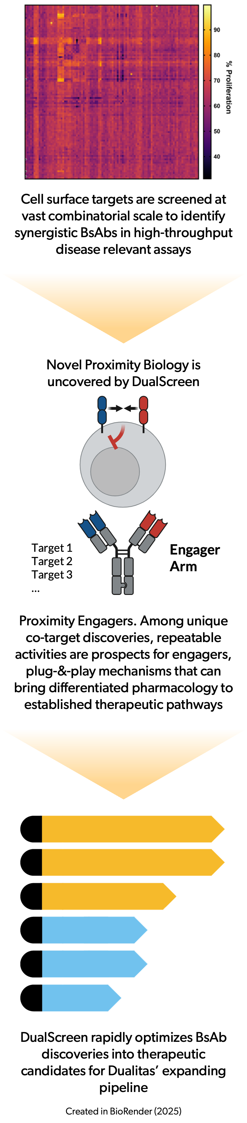 Existing BsAb discovery approaches narrowly focus on pre-determined target pairs of known biology. In contrast, DualScreen functionally screens cell surfaceomes – the entire cell surface – across a vast range of targets and epitopes to identify BsAb combinations that are truly synergistic rather than simply additive. Up to 100,000+ unique bispecific combinations can be arrayed and screened in high throughput functional assays to identify BsAbs and co-targets with synergistic activities unachievable by conventional therapeutics. DualScreen discovers powerful cell surface proximity mechanisms and rapidly delivers BsAbs with differentiated pharmacology.